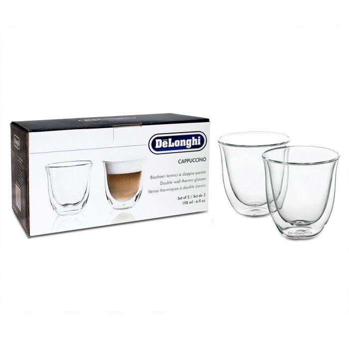 These double-wall thermo cappuccino glasses from DeLonghi are made from hand blow borosilicate glass and have been designed to keep hot or cold whilst maintaining a cool temperature to the external wall.